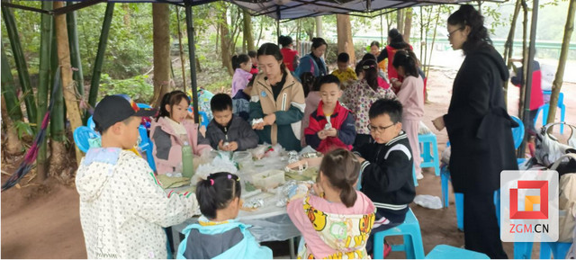 中午的野餐体验是制作叫花鸡翅。孩子们在志愿者指导下,先用荷叶包裹鸡翅,再小心用锡纸封装,交给志愿者进行烤制。在此期间,老师还带领孩子们用捡来的树叶做游戏,乐趣满满。